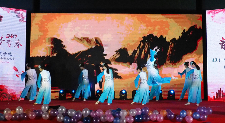 晚会共分为“风华雅韵”、“同窗共话”、“曼舞韶光”、“追梦逐歌”四个篇章,涵盖了歌曲、舞蹈、民乐、小品、相声等多种艺术表现形式。学生们热情奔放的舞蹈、声如天籁的歌曲、琴瑟婉转的民乐、诙谐幽默的小品在舞台上诉说着对新年的热情,烘托出晚会喜庆的氛围。老师们也走上舞台,用歌曲、小品演出新年的欢快,展现出教学之外的别样情感。