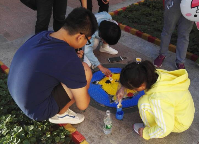 通过学生们的涂鸦创作,小区内呈现《山气日夕佳,飞鸟相与还》《井底之蛙》《龙猫带你回到梦幻的童年世界》等19幅色彩斑斓的井盖艺术作品。