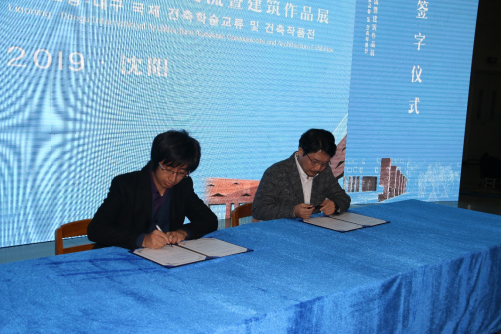 开幕式后,学院教授金承协主持颁奖仪式,李相洪向大邱国际建筑大展中的世界大学生作品展获奖者和指导教师颁奖。其中学院学生李泉获得2019年大邱国际建筑大展世界大学生作品展金奖,学院教师李明获得大邱-庆北建筑家会与辽宁省土木建筑学会交流贡献奖。为促进韩国庆北大学同东北大学建筑学科交流,双方高校代表李相洪和曲艺签署了交流协议。