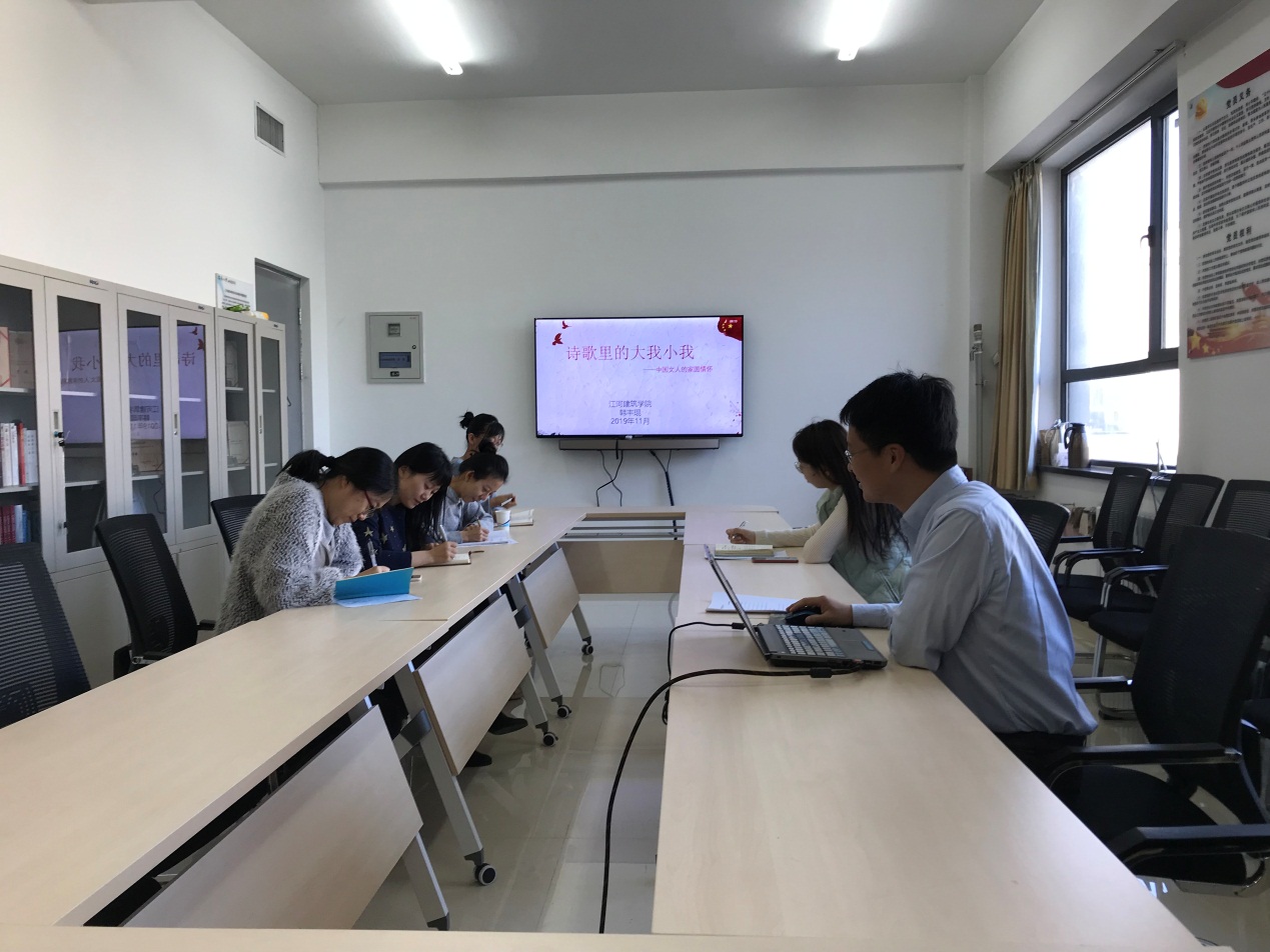 11月11日,学院机关党支部书记韩丰琨于建筑学馆A409室为全体机关党员带来题为“诗歌里的大我小我——中国文人的家国情怀”主题党课。