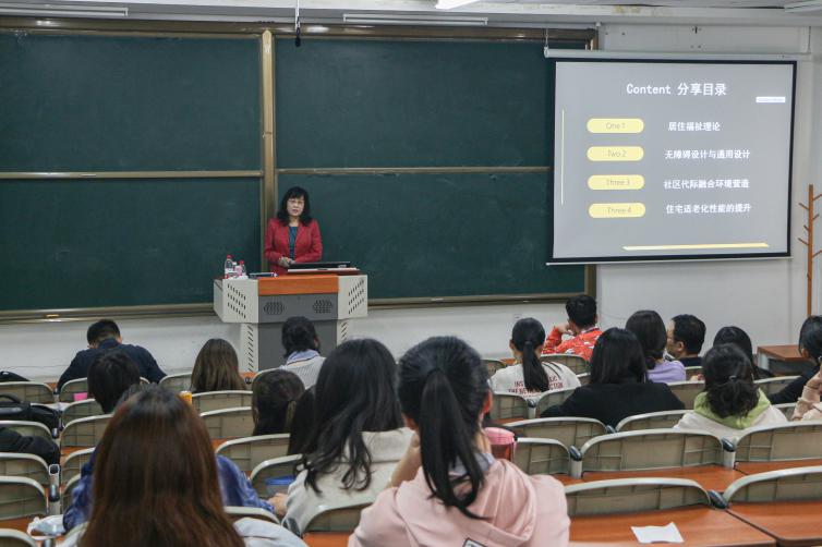 胡惠琴基于人口老龄化的社会背景,深入分析城市中适合老年人生活休憩的环境,初步探讨老龄化背景下福祉型社区建设的要点和策略,并从多样性视角、时间视角、可支付视角等多个角度系统分析福祉型社区实现的条件。胡惠琴还利用实际事例为学院师生说明了适老化设计的必要性。在报告过程中,胡惠琴还展示了许多得到成功应用的建筑和社区规划适老化设计图,供学院师生借鉴学习。