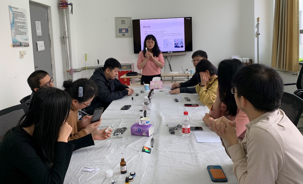学院周琴老师为大家介绍了制作香水的原料及方法,并手把手教授大家如何进行香水的调制。在现场,老师们热情洋溢、兴致勃勃,她们拿出平时做学问的严谨作风,拿着量杯、滴管仔细地计算各种试剂的用量,力争做到准确无误,每个人都认真地制作自己的专属作品,尽情体验手工制作的喜悦。