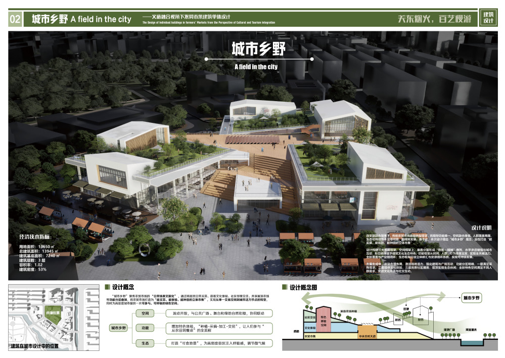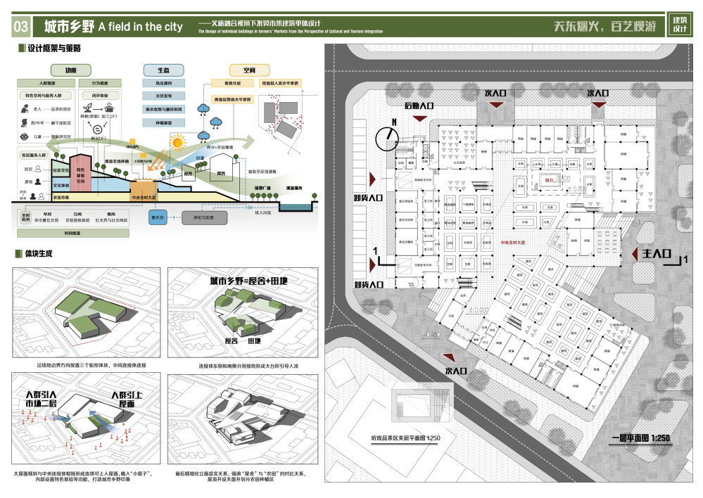 设计聚焦沈阳市迎春早市,从文旅融合视角展开农贸市场转型升级的城市设计与建筑单体设计。项目位于沈阳核心发展板块,周边居住区与商场众多,客源丰富但竞争大,同时拥有迎春湖和公园的生态资源。城市规划设计部分,针对场地面临的诸多困境与问题,项目计划以文旅融合视角,规划整合早夜市、农贸市场等东北文化特色市集,打造一个集生态休闲、文化体验与市井烟火于一体的城市活力片区,满足周边居民日常生活需求的同时,吸引游客沉浸式感受东北民俗风情。基于定位,五态重塑为理念,从生态、业态、形态、社态和文态五个方面推进。建筑单体设计选取农贸市集,针对传统农贸市场服务人群、空间、功能、生态等方面的问题,提出城市乡野设计概念,通过聚焦如何将农贸市场的“日常场景文旅化”的问题,计划将其打造为“能种田、能加工、能买菜的立体农贸市集”。设计将居民日常买菜、游客文化体验、社区邻里交往、共享屋顶农场等功能分层叠加,实现从单一交易空间到城市活力节点的转型,同时为高密度城市提供一片可参与、可呼吸的绿色空间。空间上,水平垂直双向增加开放性,呼应城市空间;功能上,一层保留交易功能,满足居民日常购物需求,二三层分别针对游客和居民设置文化体验和社区活动功能,同时为满足老中幼等不同年龄段人群的需求,设置了不同的特色体验空间;生态上,通过屋顶种植、雨水收集与利用等生态设计,提升了建筑的可持续性。