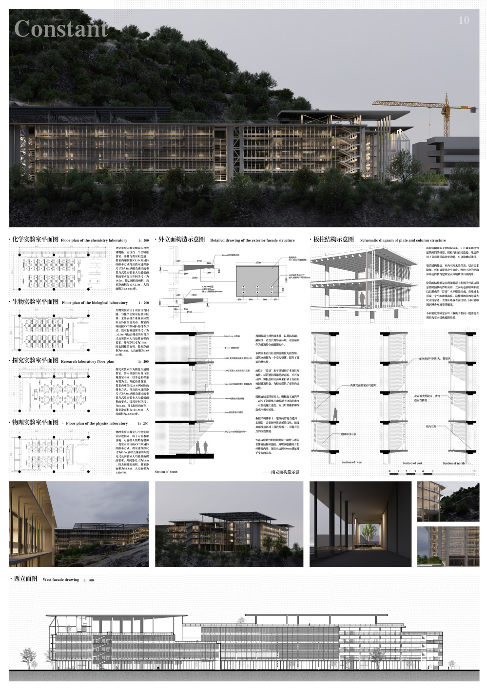 设计场地位于城市与自然边界,城市活力与自然静谧为最大的特征。在这里,得以依托教育摒弃复杂的概念,重链结构与建筑原作的关联,从而深刻地揭示出场所精神。南侧的实验楼教学区展现建筑技术美学,为高中学生提供一个深刻感受建筑结构与构造科学的引力场,结构与设备的暴露与展示是对未来时代的一个建筑隐喻,促进学生对于未来工学的认知与探索。