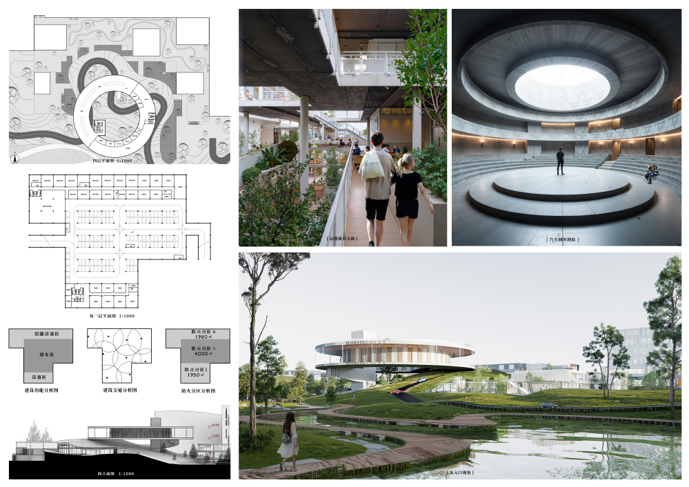 项目基地位于吉林省长春市电影城旧址,依托城市工业文化基因与电影艺术底蕴,旨在打造一座融合汽车工业主题、文化体验与公共生活的新型复合空间。设计以“工业记忆再生”为核心理念,通过覆土建筑形态与架空环廊的立体化空间叙事,回应长春汽车工业发展历程,屋顶覆土坡道与景观自然衔接,形成生态史与电影文化特色:建筑主体采用覆土形势呼应园区步道系统,下方形成公共广场,顶部覆土界面兼具节能效益;首层抬升的环形架空廊道与车道无缝对接园区交通,实现人车分流。功能布局上,沿街以退台层叠的商业体块延续城市生活服务,植入文创、餐饮等业态激活片区活力;内部纵向分区涵盖汽车服务工艺展示、创客空间等功能,并通过天窗体系与风廊组织优化光环境与通风效率。建筑以锈蚀钢板、玻璃幕墙与钢结构演绎工业美学,保留齿轮雕塑等遗迹形成“记忆长廊”,最终构建一处缝合城市肌理、对话历史与未来的文化地标。